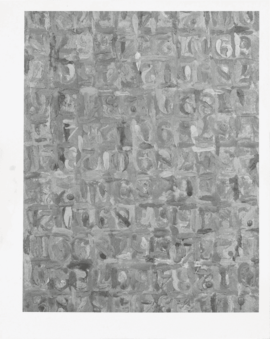 As for Gray Numbers, it was also in some ways a work of grief. Johns went on to paint many larger works in which gray predominated. The poet and art critic John Ashbery once wrote that when it came to gray Johns longed to explore “what it is, where it comes from, how it both begins and ends in light.” So also, small paintings can have about them an allure that comes from their pulling the viewer in close. Their beginning and ending is a kind of epiphany—providing an “aha” moment of the smallest kind.