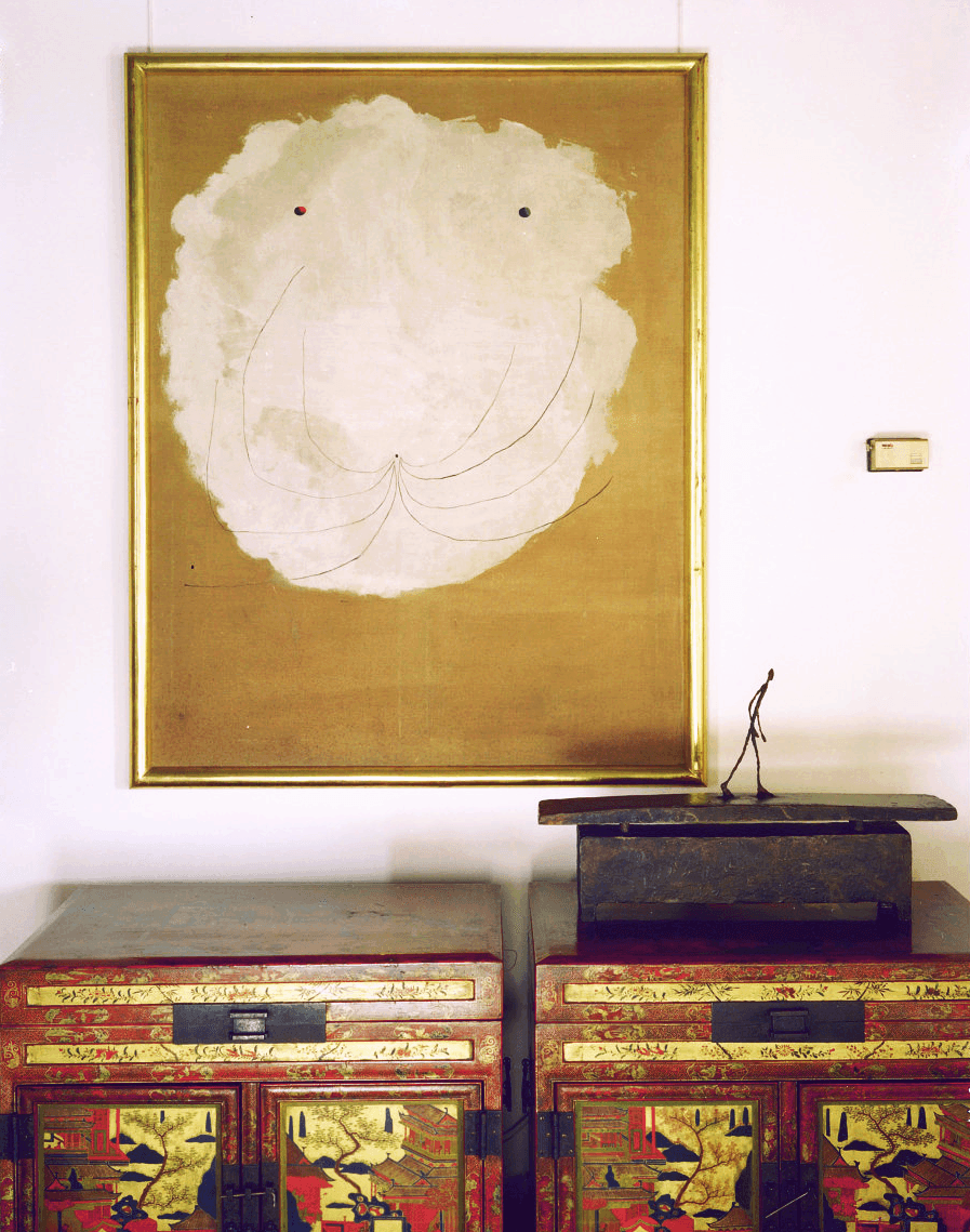 Giacometti, Man Walking Quickly Under the Rain. Joan Miró, Le Chat Blanc on the wall of the Tremaines' home, circa 1984. Photo: Adam Bartos; Emily Hall Tremaine papers, circa 1890-2004, Archives of American Art, Smithsonian Institution. © Alberto Giacometti Estate / VAGA at Artists Rights Society (ARS), NY / ADAGP, Paris